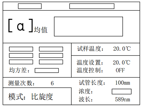 b) 測比旋度時,模式選 2,測量內(nèi)容顯示比旋度,數(shù)據(jù)欄顯示[α]及[α] 均值,需要在設(shè)置時輸入試管長度(mm)、溶液濃度及測量次數(shù),腳標(biāo)均值表示平均值。