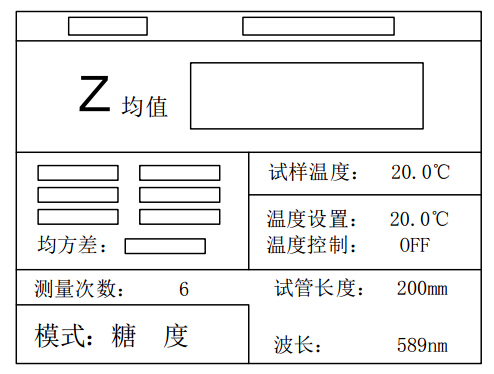 d) 測糖度時,模式選 4,測量內(nèi)容顯示國際糖度,數(shù)據(jù)欄顯示 Z 及 Z 均值,需要輸入測量的次數(shù)。儀器在轉(zhuǎn)換成糖度顯示時均當(dāng)作 200mm 長度試管處理,如果使用其它長度試管可自行簡單計算。