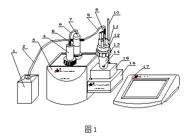 如圖:儀器由控制單元(17)、容量滴定單元(3)、電導(dǎo)測量單元(16)三部分組成。其中,可由PC機(需安裝本廠ZDJ-5型自動滴定儀控制軟件)代替控制單元進行滴定控制。