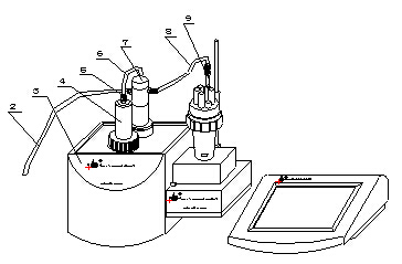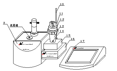 a 將容量滴定單元(3)與和控制單元放在試驗臺上,按圖示將攪拌器(15)放在電導(dǎo)測量單元(16)上, 插入電極梗(10);裝入溶液杯支架(12)和溶液杯(13),在溶液杯(13)中放入攪拌珠(14),并用緊定螺釘(11)分別瑣緊攪拌器(15)和溶液杯(13)。