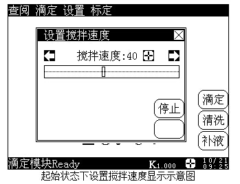 其中,設(shè)置窗口上“啟動”(或“停止”)按鍵用來啟動(或者關(guān)閉)攪拌器,滑動條以及顯示的攪拌速度對應(yīng)當(dāng)前攪拌器的實際速度值,用戶直接按滑動條或者按“<”、“>”鍵即可設(shè)置攪拌器的速度,設(shè)置完畢,按右上角的“關(guān)閉”鍵,返回儀器起始狀態(tài)。