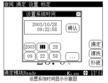 在儀器的起始狀態(tài)下,按菜單項“設(shè)置”鍵,選擇“系統(tǒng)時間”,按“確認”鍵即可設(shè)置儀器的日期、時間參數(shù)。顯示如下:
