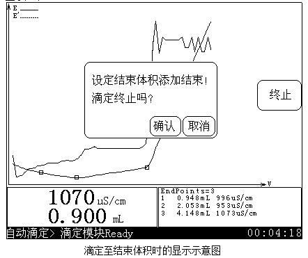 在滴定過程中,用戶隨時可按“終止”鍵來終止滴定。儀器將詢問用戶是否真的終止滴定,顯示“終止滴定嗎?”等字樣,用戶可按實際需要終止或繼續(xù)滴定下去。如果儀器發(fā)現(xiàn)已添加完用戶所設(shè)定的結(jié)束體積(最大體積),則儀器將自動提示用戶,是否繼續(xù),同樣用戶可按實際需要選擇終止滴定或繼續(xù)滴定。按“確認”鍵結(jié)束滴定,按“取消”鍵,繼續(xù)滴定;顯示如下: