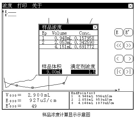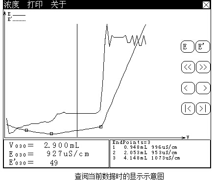 其中上面為菜單項,包括“濃度”(如果有終點的話)、“打印”、“關(guān)于”和“關(guān)閉”鍵;中間為滴定曲線區(qū),用戶可以查閱滴定數(shù)據(jù);左下角為指示線對應(yīng)的滴定數(shù)據(jù),包括電導(dǎo)值、體積、微分等;右下角為終點區(qū),顯示終點數(shù)和對應(yīng)終點值。