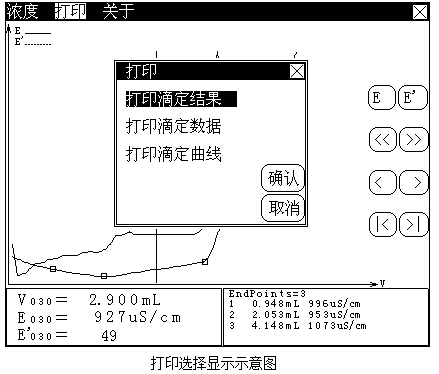 滴定結(jié)束后,如果用戶需要打印滴定結(jié)果、滴定數(shù)據(jù)、滴定曲線,則可按菜單項“打印”鍵,顯示如下,選擇需要打印的內(nèi)容,打開打印機電源,儀器即可打印相應(yīng)內(nèi)容。