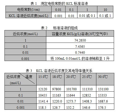 根據(jù)電極常數(shù),選擇合適的標準溶液(見表1)、配制方法(見表2)、標準溶液與電導(dǎo)率值關(guān)系表(見表3);