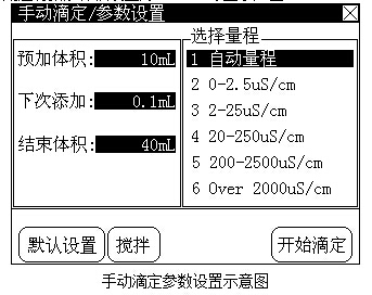 為了保證測量的準確性,當(dāng)用戶知道當(dāng)前滴定的電導(dǎo)率范圍時,建議用戶使用手動量程,選擇對應(yīng)的量程進行滴定;否則用戶可以使用自動量程檔進行滴定。