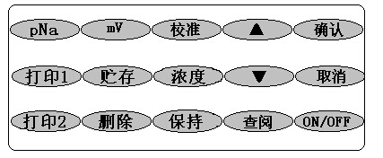 儀器共有15個操作鍵,分別為:ON/OFF、pNa、mV、濃度、校準(zhǔn)、打印1、打印2、貯存、刪除、查閱、保持、▲、▼、確認(rèn)和取消。