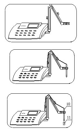b) 溶解氧電極(10)夾在多功能電極架(9)上。