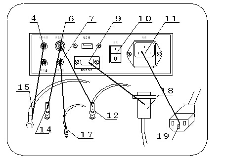 b. 分別將測(cè)量電極(PF-1氟電極(12))、參比電極(232參比電極(15))和溫度傳感器(17)安裝在REX-1多功能電極架(20)上,燒杯放在JB-1A型電磁攪拌器(16)上。將Q9短路插頭(14)拔下,將PF-1氟電極(12)插入測(cè)量電極座(6);將參比電極(232參比電極(15)接入?yún)⒈入姌O座(4);將T-820D型溫度傳感器(17)插入溫度電極座(7);取下電源插座(11)上保險(xiǎn)絲蓋,放入0.5A/220V保險(xiǎn)絲,蓋好保險(xiǎn)絲蓋(出廠前已放入保險(xiǎn)絲);將國際通用電源線(19)插入電源插座(11);若用戶配置TP―16型打印機(jī)(打印機(jī)的安裝見該產(chǎn)品使用說明書),則將打印機(jī)連線(18)分別插入儀器的RS-232插座(9)和打印機(jī)插座內(nèi)。