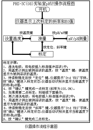 在測量狀態(tài)下,按“mV/pH”鍵可以切換顯示電位以及pH值;按“溫度”鍵設(shè)置當(dāng)前的溫度值;按“定位”或“斜率”鍵標(biāo)定電極斜率,簡要的操作流程見下圖: