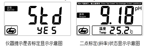 進(jìn)入標(biāo)定狀態(tài)后,儀器會自動識別當(dāng)前標(biāo)液并顯示當(dāng)前溫度下的標(biāo)準(zhǔn)pH值,顯示如圖(此時顯示的數(shù)據(jù)可能與測量狀態(tài)下的pH值不同),按“確認(rèn)”鍵,儀器存貯當(dāng)前的標(biāo)定結(jié)果,并顯示斜率和E0值,返回測量狀態(tài);如果用戶想放棄標(biāo)定,可按“pH/mV”鍵,儀器退出標(biāo)定狀態(tài),返回當(dāng)前測量狀態(tài)。