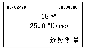 不論儀器處于何種工作狀態(tài),按“mV”鍵,儀器即進入mV設置的測量方式工作狀態(tài),此時儀器顯示當前的電極電位(mV)值和溫度值。其測量方式工作狀態(tài)的功能與pN相同。