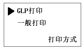 打印方式設置:當光標“▶”指打印方式設置參數(shù)項時,按“確定”鍵,儀器顯示如下。用戶通過“▲”或“▼”鍵移動光標“▶”指向所需打印方式(GLP打印或一般打�。�。再按“確定”鍵予以確認,儀器自動退出打印方式設置狀態(tài)。
