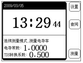 儀器的起始狀態(tài)顯示如圖,其中顯示屏左上方顯示有當前的系統(tǒng)時間;下方為當前設(shè)置好的測量模式,包括測量參數(shù);右面為“設(shè)置”、“查閱”以及“測量”按鍵。右上方的“設(shè)置”按鍵,可以設(shè)置測量模式、手動溫度、系統(tǒng)設(shè)置以及設(shè)置電極常數(shù)和TDS轉(zhuǎn)換系數(shù)等;中間的“查閱”按鍵,可以查閱電導測量參數(shù)、TDS測量參數(shù)以及查閱存貯數(shù)據(jù);右下方為“測量”按鍵,按此鍵即可開始測量。