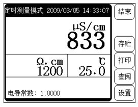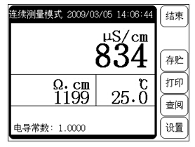 其中顯示屏上方顯示有當前的測量模式、系統(tǒng)時間;測量主窗口顯示當前的電導率以及對應(yīng)的電阻率和溫度值;顯示屏右面為按鍵,分別為“結(jié)束”、“存貯”鍵、“打印”鍵、“查閱”和“設(shè)置”鍵等。