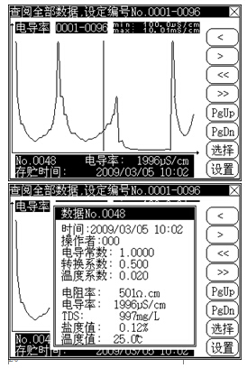 按“查閱”鍵可查閱電導測量參數(shù)等,具體參見查閱電導測量參數(shù)章節(jié)。