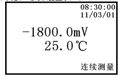 當(dāng)儀器處于pH測(cè)量工作狀態(tài),按“mV”鍵,儀器即進(jìn)入mV測(cè)量工作狀態(tài),此時(shí)儀器顯示如下: