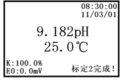 此時(shí),按“取消”鍵,則儀器返回相應(yīng)的工作狀態(tài)。若按“標(biāo)定”鍵,儀器即進(jìn)入“標(biāo)定2”工作狀態(tài)。若儀器顯示屏左上方顯示“E0或K值超差!”,說(shuō)明電極有可能損壞,提醒用戶需更換電極。