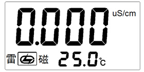 經(jīng)過(guò)上述4.3~4.4的設(shè)置,儀器可用來(lái)測(cè)量被測(cè)溶液,按“電導(dǎo)率/TDS”鍵,使儀器進(jìn)入電導(dǎo)率測(cè)量狀態(tài)。儀器顯示如圖: