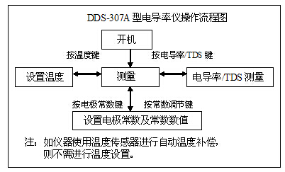 在測(cè)量狀態(tài)下,按“電導(dǎo)率/TDS”鍵可以切換顯示電導(dǎo)率以及TDS;按“溫度”鍵設(shè)置當(dāng)前的溫度值;按“電極常數(shù)”和“常數(shù)調(diào)節(jié)”鍵進(jìn)行電極常數(shù)的設(shè)置,簡(jiǎn)要的操作流程見(jiàn)下圖: