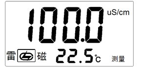 如果采用溫度傳感器,儀器接上電導(dǎo)電極、溫度電極,用蒸餾水清洗電極頭部,再用被測(cè)溶液清洗一次,將溫度電極、電導(dǎo)電極浸入被測(cè)溶液中,用玻璃棒攪拌溶液使溶液均勻,在顯示屏上讀取溶液的電導(dǎo)率值。如溶液溫度為22.5℃,電導(dǎo)率值為100.0uS/cm,則儀器顯示如圖: