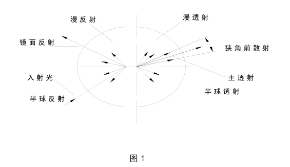如圖1所示,光線射到一透明或半透明物體上時,部分產(chǎn)生定向反射,部份產(chǎn)生漫反射,進(jìn)入樣品合部份被吸收,部分被透過,出射樣品的光中,主透射部份按折射定律前進(jìn),部份產(chǎn)生半球透射,其前進(jìn)方向是散亂的。