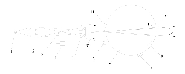 由光源1(鹵鎢燈)發(fā)出的光經(jīng)聚光鏡2會聚,通過光欄3,經(jīng)遮光式調(diào)制器4射到物鏡5 上,物鏡 5 射出一束平行光束,其光線偏離角不大于 3o,并將光欄 3 成像在出射窗 10上,出射窗對入射窗口中心的張角為 8 o,光斑邊緣與出射擊窗形成 1.3 o的環(huán)帶。積分球 7 內(nèi)裝有一可擺動的標(biāo)準(zhǔn)反射器 9,當(dāng)測定透光率及總透射光時,標(biāo)準(zhǔn)反射器被控在位,擋住出射窗;當(dāng)測散射光時,從出窗處讓開。
