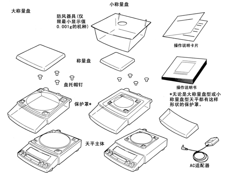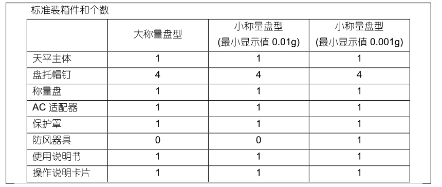 請(qǐng)打開包裝箱,取出天平和附件。請(qǐng)根據(jù)天平的機(jī)種確認(rèn)以下的標(biāo)準(zhǔn)裝箱件齊全、無破損。