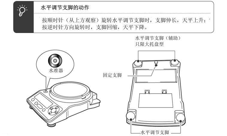 4 按順時(shí)鐘方向旋轉(zhuǎn)后部的水平調(diào)節(jié)支腳(輔助),伸出直到2 處都輕輕地接觸,此時(shí)注意如果后部的水平調(diào)節(jié)支腳(輔助)伸出過長(zhǎng),則天平發(fā)生傾斜。