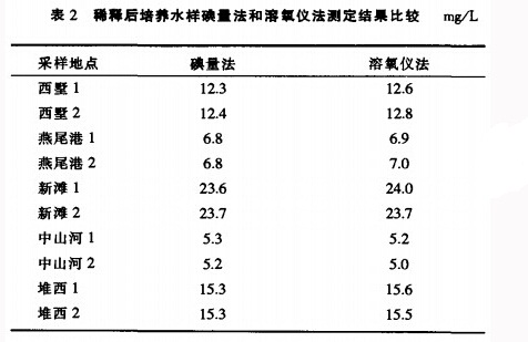 由表1、表2數(shù)據(jù)可以得出:碘量法和溶氧儀法測(cè)定無顯著性差異,最大相對(duì)偏差為1.7%,符合標(biāo)準(zhǔn)規(guī)定的允許差要求,能滿足日常檢測(cè)工作的需要。