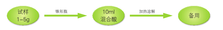 2. 加 10ml 混合酸,加蓋浸泡過夜,加一小漏斗于電爐上加熱消解,若變棕黑色,再加混合酸,直至冒白煙,消化液呈無色透明或略帶黃色,放冷,用滴管將試樣消化液洗入或過濾入 10-25ml 的容量瓶中,用少量的水多次洗滌錐形瓶或高腳燒杯,洗液合并與容量瓶中并定容至刻度,混勻備用,同時(shí)作試劑空白。