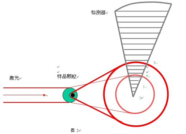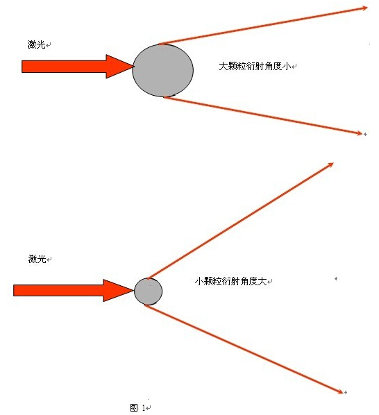 激光粒度儀是基于光衍射現(xiàn)象而設計的,當顆粒通過激光光束時,顆粒表面會衍射光,而衍射光的角度與顆粒的粒徑成反向的變化關系,即大顆粒衍射光的角度小,小顆粒衍射光的角度大,如圖 1 所示。