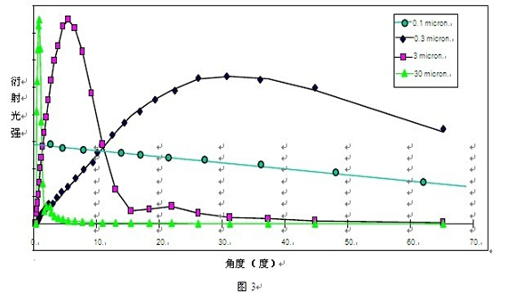 然后再通過該位置的檢測器所接收到的衍射光的強度,得到所對應粒徑顆粒的百分比含量。但是,顆粒衍射光的強度對角度的依賴性是隨著顆粒粒徑的變小而降低,如圖 3 所示。當顆粒小到幾百納米時,其衍射光強對于角度幾乎完全失去依賴性,即此時的衍射光會分布在很寬的角度范圍內,而且單位面積上的光強很弱,這無疑增加了檢測的難度。
