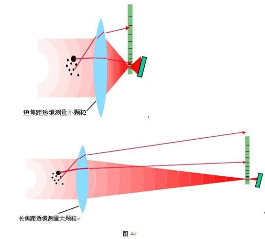 多透鏡系統(tǒng)曾在二十世紀八十年代前被廣泛采用,它使用傅里葉光路配置即樣品池放在聚焦透鏡的前方,配有多個不同焦距的透鏡以適應不同的粒徑范圍,如圖 4 所示,優(yōu)點是設計簡單,只需要分布于幾十度范圍的焦平面檢測器,成本較低。缺點是如果樣品粒徑范圍寬的時候需要更換透鏡,不同透鏡的結果需要拼合,對一些未知粒徑的樣品用一個透鏡測量時可能會丟失信號或對于由于工藝變化導致的樣品粒徑變化不能及時反映。