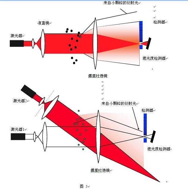 多光源技術也是采用傅里葉光路配置即樣品池在聚焦透鏡的前方,一般只有分布于幾十度角度范圍的檢測器,為了增大相對的檢測角度,使該檢測器能夠接收到小顆粒的衍射光信號,在相對于第一光源光軸的不同角度上再配置第一或第二激光器,如圖 5 所示。這種技術的優(yōu)點是只需分布于幾十度角度范圍的檢測器,成本較低,測量范圍特別是上限可以比較寬,缺點是分布于小角度范圍的小面積檢測器同時也被用于小顆粒測量,由于小顆粒的衍射光在單位面積上的信號弱,導致小顆粒檢測時的信噪比降低,這就是為什么多光源系統(tǒng)在測量范圍上限超過 1500 微米左右時,若要同時保證幾微米以下小顆粒的準確測量,需要更換短焦距的聚焦透鏡。另外,多透鏡系統(tǒng)在測量樣品時,不同的激光器是依次開啟,而在干法測量時,由于顆粒只能一次性通過樣品池,只有一個光源能被用于測量,所以一般采用多透鏡技術的干法測量的粒徑下限很難低于 250 納米。