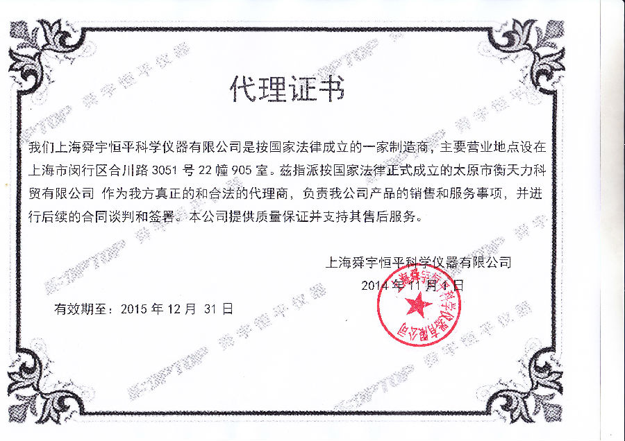 電子天平是基本的實(shí)驗(yàn)分析儀器,應(yīng)用廣泛,銷售廠家也很多。在購(gòu)買時(shí)請(qǐng)選擇售后維修服務(wù)好的生產(chǎn)廠家和正規(guī)代理商。太原衡天力是島津的正規(guī)授權(quán)代理商,證書如下: