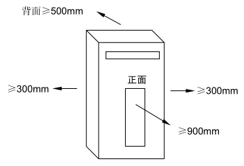 7) 設(shè)備距四周物件或墻壁間距:前≥900mm,左、右及頂≥300mm、后≥500mm(如圖所示)