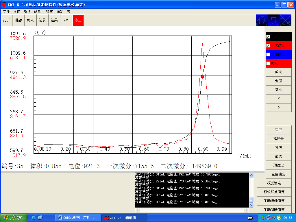 終點(diǎn)1體積:0.855mL 電位值:921.3mV 濃度:1.40787mg/L