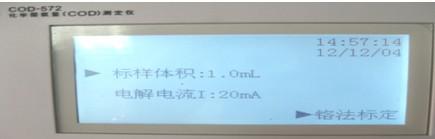 水樣中COD值小于30mg/L時(shí),取1ml重鉻酸鉀進(jìn)行測(cè)量,取10ml水樣加2ml重蒸餾水和17ml硫酸-硫酸銀溶液(3.2.c),加熱回流15分鐘,稍冷加33ml重蒸餾水及7ml硫酸鐵溶液,冷卻至室溫。加入攪拌子,連接好電解電極及檢測(cè)電極。放在攪拌器上調(diào)節(jié)合適的攪拌速度。開機(jī),儀器顯示如下圖,按“切換”鍵,選擇鉻法進(jìn)行測(cè)量試驗(yàn)。