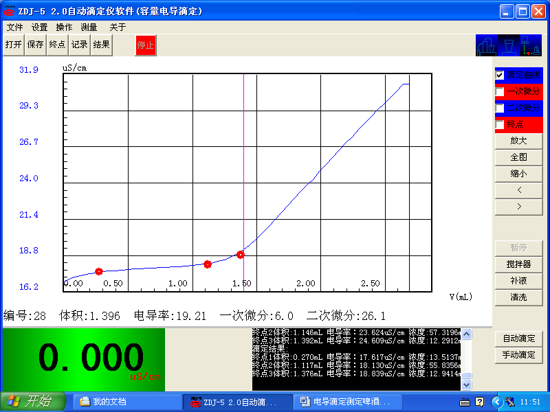 吸取10.0ml萃取清液至50ml燒杯,加入40ml甲醇,插入DJS-1C型電導電極,放在ZDJ-5型滴定儀上用2%乙酸鉛溶液進行滴定,在5min內滴定完畢。