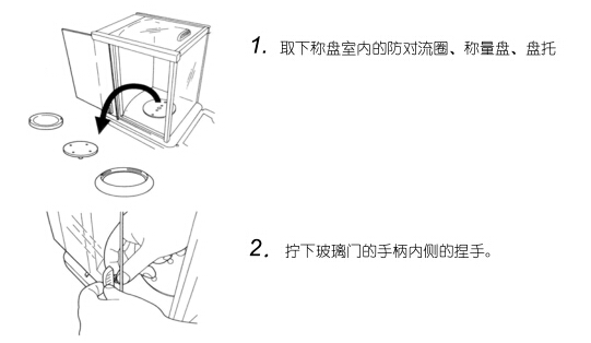 砠下玻璃門手柄內(nèi)側(cè)的捏手時,請小心謹慎,手不要碰到稱量室內(nèi)的盤托軸。