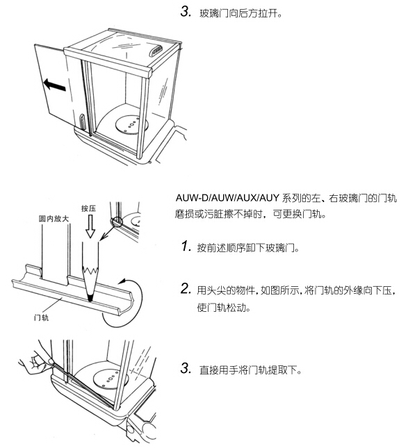操作時請?zhí)貏e小心不要讓門軌劃傷手。玻璃拉門不滑時AUW-D/AUW/AUX/AUY系列可以卸下玻璃門,清掃門軌。