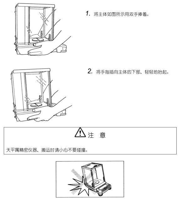 用手搬運時:取下稱量室內(nèi)的防對流圈、稱量盤、盤托后,如圖所示抬起,用雙手牢牢抓住搬運。