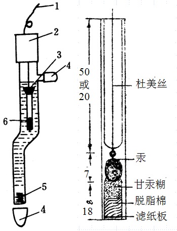 甘汞電極由甘汞芯子、電極玻殼、鹽橋溶液、液絡(luò)部和電極導(dǎo)線組成,其結(jié)構(gòu)示意圖如下: