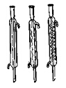 冷凝管 | 規(guī)格:有直形、球形、蛇形和刺形等 用途:用于蒸餾液體或有機(jī)備置中,起冷凝或回流作用。 | 冷凝管在使用時應(yīng)將靠下端的連接口以塑膠管接上水龍頭,當(dāng)作進(jìn)水口。因為進(jìn)水口處的水溫較低而被蒸氣加熱過后的水,溫度較高;較熱的水因密度降低會自動往上流,有助于冷卻水的循環(huán)。 |