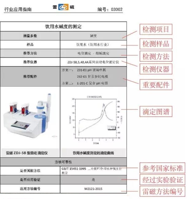 《行業(yè)應(yīng)用指南》針對不同行業(yè)的分析測試需求,以簡易的表格形式列出完成該檢測項目所需的關(guān)鍵信息。包括:行業(yè)信息、測試項目、樣品名稱、測試方法、主要儀器設(shè)備、關(guān)鍵配件、測試圖譜(如有)、測試方法依據(jù)、以及雷磁《應(yīng)用方法》文件信息。