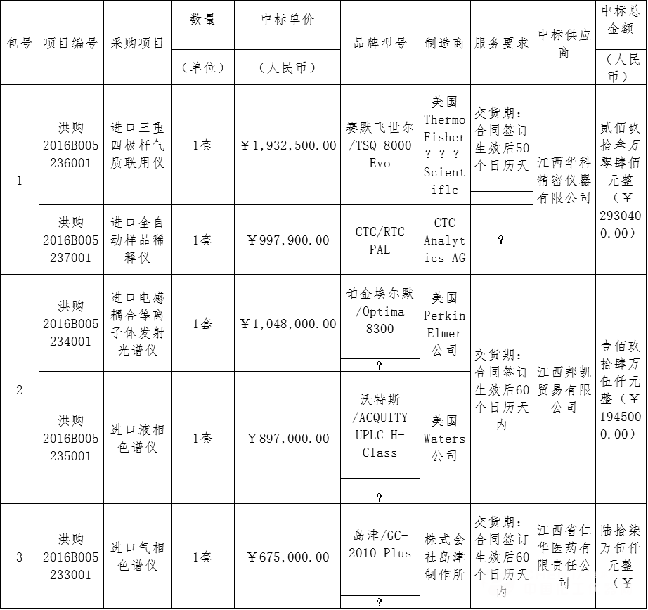 2016年7月18日,南昌市疾病預(yù)防控制中心進(jìn)口設(shè)備采購(gòu)項(xiàng)目中標(biāo)結(jié)果公布,賽默飛世爾、沃特世、島津等全球知名企業(yè)入圍,分別是賽默飛世爾公司的進(jìn)口三重四極桿氣質(zhì)聯(lián)用儀、CTCAnalyticsAG(瑞士思特斯分析儀器公司)的進(jìn)口全自動(dòng)樣品稀釋儀、美國(guó)PE的進(jìn)口電感耦合等離子體發(fā)射光譜儀、Waters公司的進(jìn)口液相色譜儀以及島津公司的進(jìn)口氣相色譜儀。