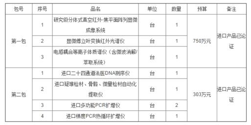 7月25日,甘肅省公安廳全省刑事技術(shù)鑒定中心發(fā)布了實(shí)驗(yàn)室設(shè)備招標(biāo)公告,采購儀器包括顯微成像系統(tǒng)、紅外光譜儀、離子體質(zhì)譜儀、PCR擴(kuò)增儀等檢測(cè)儀器,總預(yù)算達(dá)到了1053萬(人民幣)。