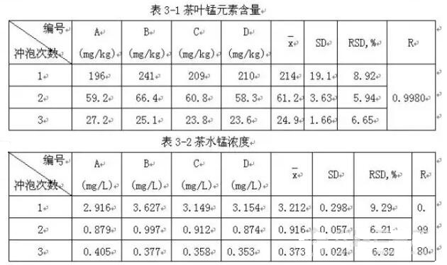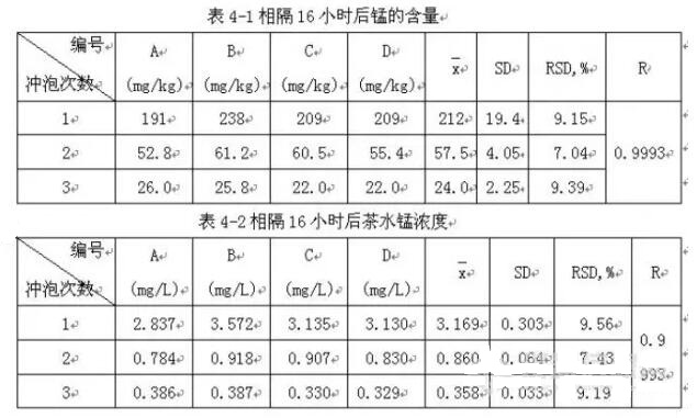 2.1測得沖泡3道后茶葉錳元素含量及茶水濃度見表3、表4: